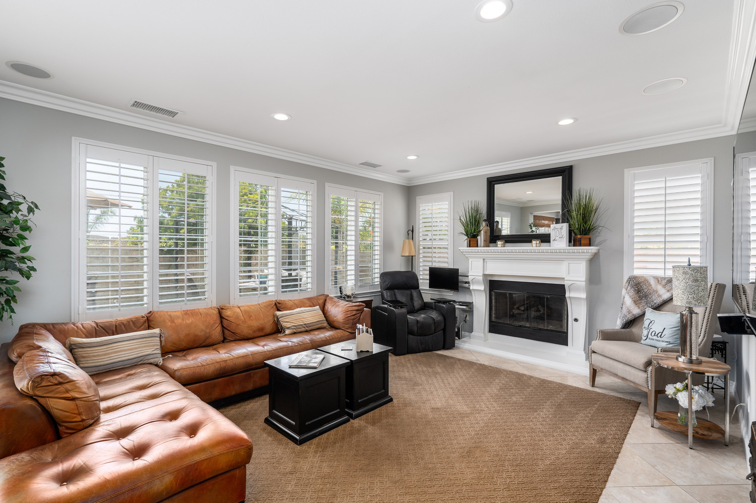 This home is ready to move right into! Original owners are selling this beautiful 3 bedroom, 2 full bathrooms upstairs and office/bedroom and full bath downstairs. Beautiful vaulted ceiling in the living room with crown molding and wood shutters throughout.